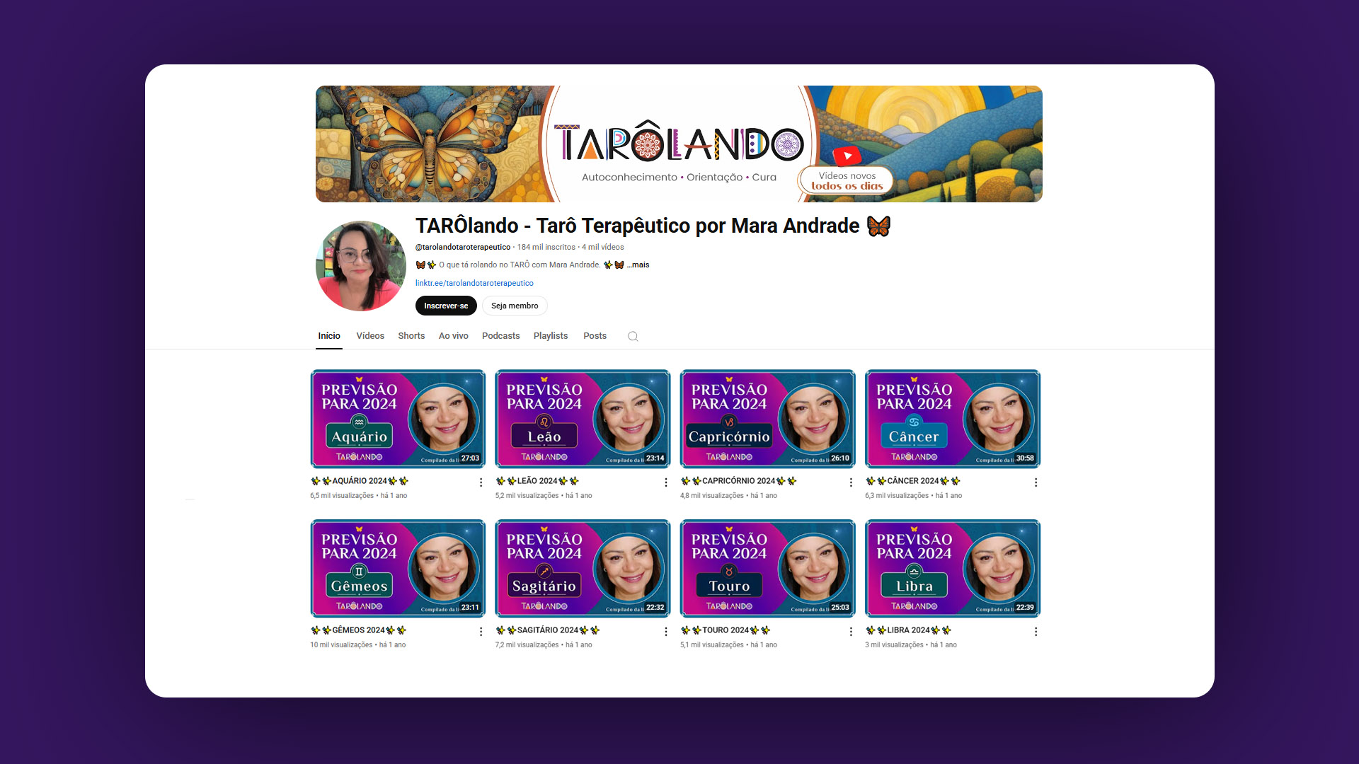 Nosso processo começou com a criação e o desenvolvimento da marca Tarôlando, estabelecendo uma identidade visual que refletisse a essência do canal: um ambiente acolhedor, místico e inspirador. Cuidamos de todos os elementos visuais para garantir que a comunicação fosse coesa e transmitisse a seriedade e o propósito do projeto.